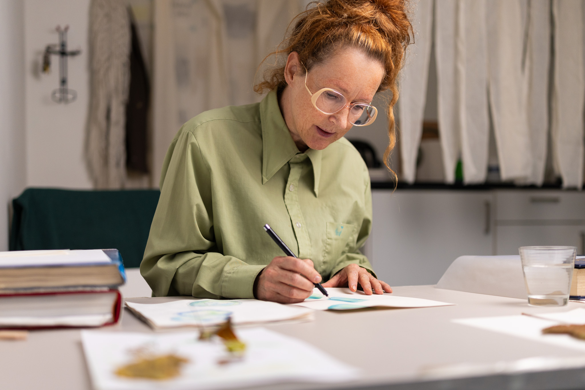 Tijdens mijn periode in het Tuinatelier observeerde ik hoe het licht door de bladeren viel en probeerde ik dat spel van licht en blad te vangen in beeld – het Japanse komorebi. In augustus richtte ik me op het experimenteren met zelfgemaakte plantaardige inkten op papier en linnen. De tuin nodigde me uit om te mediteren in stilte. De maand september bracht me een periode van tekenen in stilte, aandachtig de bladvormen volgend. In oktober maakte ik Plant Print drawings: afdrukken van gevallen bladeren die ik verder bewerkte met potlood en inkt. Zo ontstond een poëtische dialoog tussen natuur en tekening.